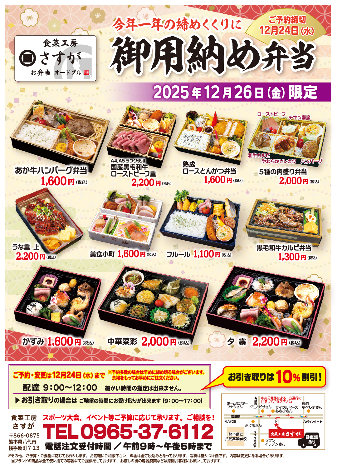 2025.05.1 お弁当、お惣菜、イタリアン、デリバリー可、パン、中華、和食、洋食 mumumu 食菜工房さすが Tweet Share RSS 食菜工房 さすがメニュー 定休日不定休 店名 食菜工房さすが 住所 〒866-0875 八代市横手新町7-13 FACEBOOK https://www.facebook.com/kumamotobentousasuga/ ホームページ https://kumamoto-bentou.net/ 電話番号 0965376112 電話受付 午前9時~午後5時 Tweet Share
